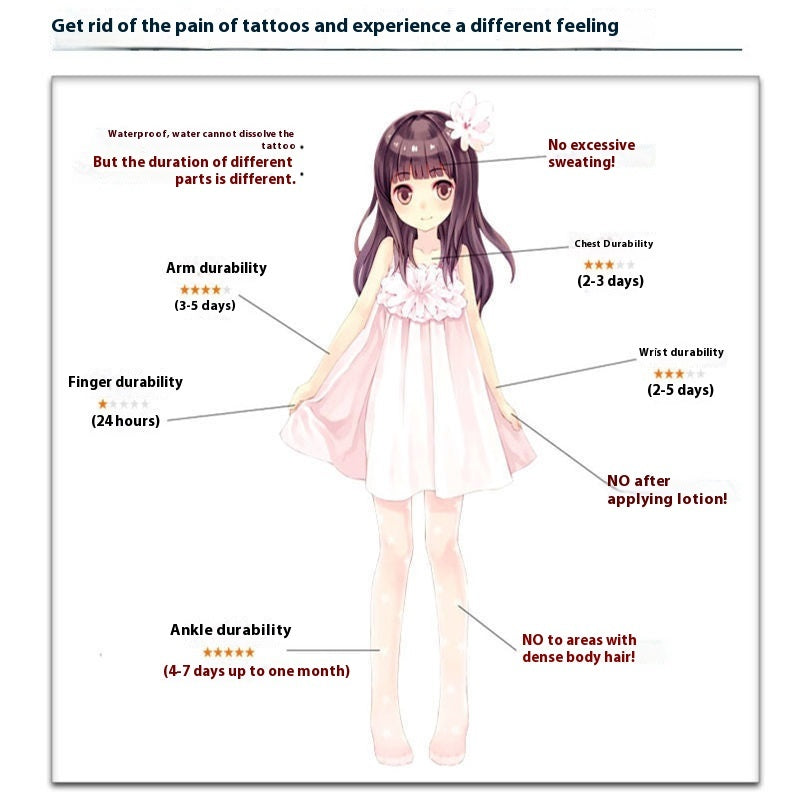 For Herbal Tattoos: Apply the tattoo to your skin and let it dry for 1β2 hours without touching or wetting it. After removal, the color will fully develop within 24 hours.
