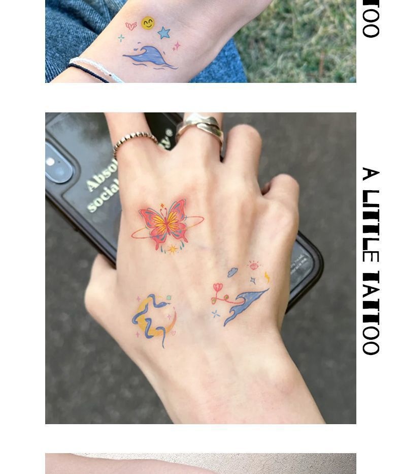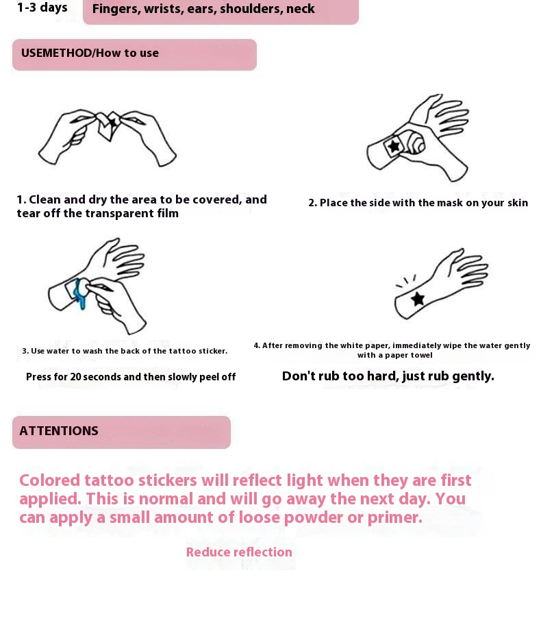 For Color Tattoos: Remove the clear film, place the tattoo face-down on your skin, and press a wet cloth on it for about 30 seconds. Then slowly peel off the backing paper.