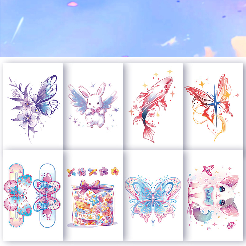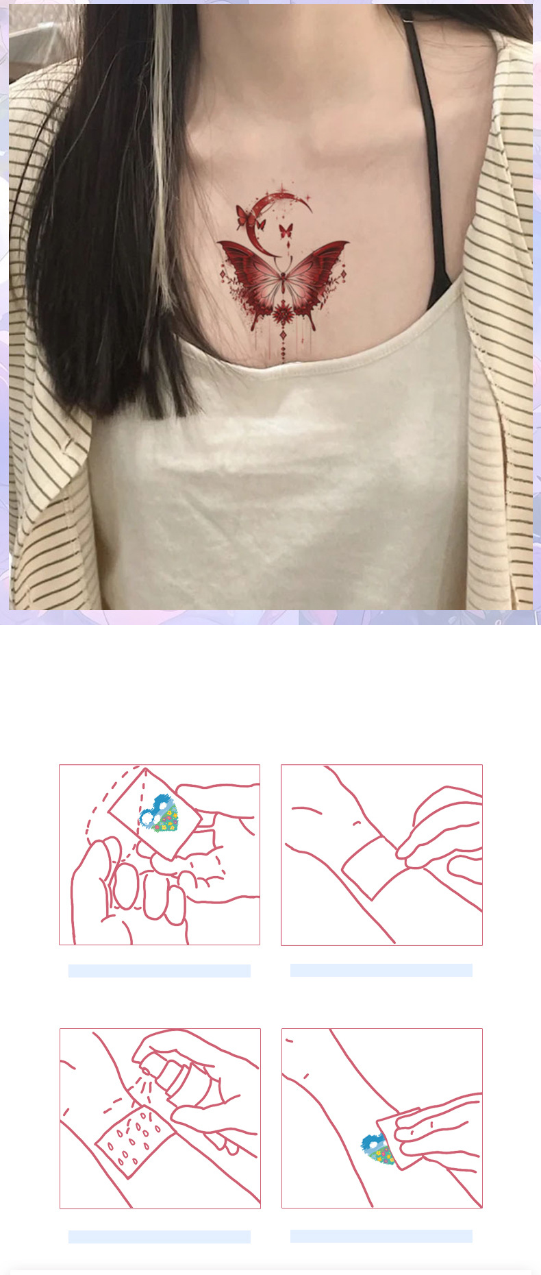 For Color Tattoos: Remove the clear film, place the tattoo face-down on your skin, and press a wet cloth on it for about 30 seconds. Then slowly peel off the backing paper.