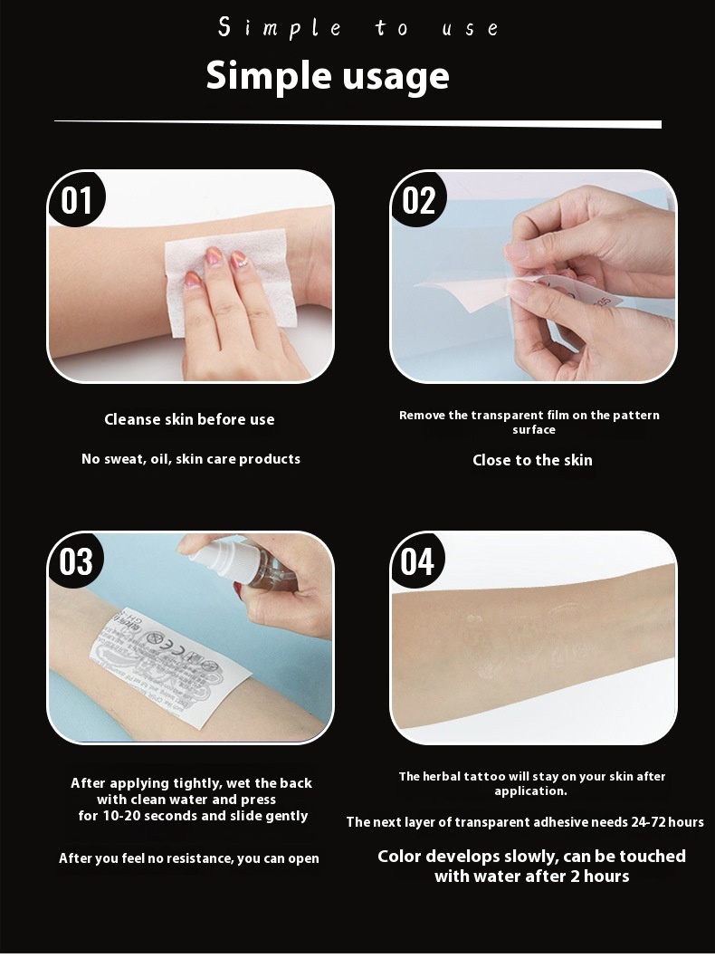 For Herbal Tattoos: Apply the tattoo to your skin and let it dry for 1–2 hours without touching or wetting it. After removal, the color will fully develop within 24 hours.