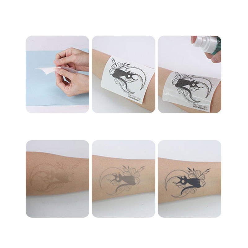 For Color Tattoos: Remove the clear film, place the tattoo face-down on your skin, and press a wet cloth on it for about 30 seconds. Then slowly peel off the backing paper.